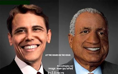 Alguns sobraram, no entanto, sendo publicados por exemplo pelo Daily Telegraph londrino da ontem e do qual retirei a 1ª imagem. A ousadia levou-me a recriar o poster, procurando dar aos dois políticos umas feições mais marcantes das suas raças trocadas. Que as políticas dos candidatos sejam, realmente, o importante na escolha!