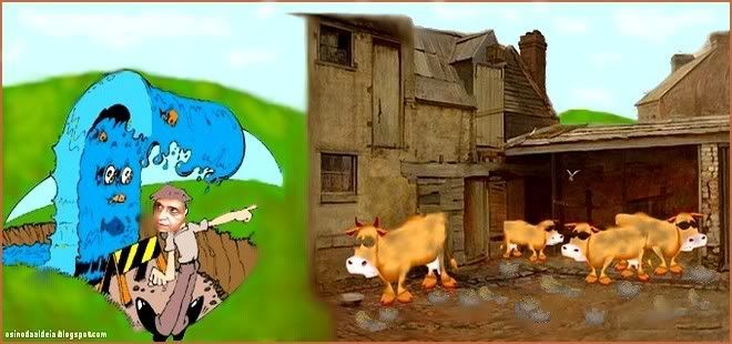Unha com carne com o tirano, havia um rei chamado Áugias Barrão, o Durão, que, apesar do nome, Áugias, não era lá muito amigo das águas. Esse rei, que vivia fora da Lusitânia, possuía numerosas cabeças de gado em cujos currais corria o esterco e onde se acumulavam excrementos há mais de vint'anos. Ora, a missão nº 5 ordenada por Julius Socretinus foi a de limpar esses currais num só dia, presenteando desse modo o amigo Barrão por favores outrora prestados e tendo em vista alianças futuras. Difícil tarefa, mas não para a nossa heroína. Pois bem! Manuelix observou aquela nojeira por todo o lado e concluíu que a única saída seria levantar uma barreira no rio Tagus, desviando a água para lavar toda a imundície. Assim pensou, assim o fez, como se pode comprovar na imagem em que se vê Manuelix a dar ordem de desvio ao rio. E, desta forma, facilmente foi vencida mais uma batalha pela libertação da Lusitânia!