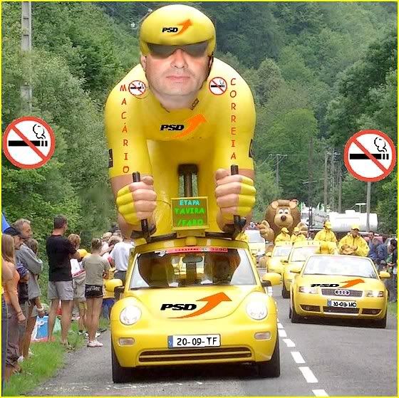 Hoje, prestes a completar 52 anos, Macário está de novo na estrada para mais uma etapa da sua vida de político-ciclista de hábitos limpos e saudáveis, sem se conspurcar com beijos a fumadoras. De Tavira para Faro segue a caravana macarista, na qual, claro, é proibido fumar. CENSURA FRESCA Vem de Torres, onde mora o melhor Carnaval de Portugal. Uma douta juíza do Ministério Público local, atendendo de imediato e sem prévia visão da matéria protestada à queixa de "um cidadão" escandalizado, ordenou à autarquia que retirasse do Carnaval as imagens de nus femininos que estavam no ecrã de uma reprodução de um computador Magalhães que faz parte de um "monumento" ao Entrudo da cidade, por considerar que se tratava de "imagens pornográficas".